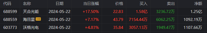 天合光能:上涨17.5%报收于22.83元,换手率3.2%,成交额14.95亿元。龙虎榜数据显示,机构合计净买入1.17亿元,北向资金合计净买入1.25亿元。