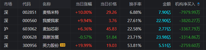 龙虎榜中涉及机构专用席位的个股中,当日净卖出额前三为麦格米特、我爱我家、麦加芯彩,分别为7979.99万元、3820.27万元、3367.79万元。
