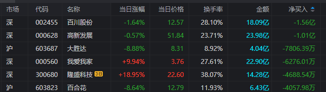 龙虎榜净卖出额前三为百川股份、高新发展、大胜达,分别为1.56亿元、1.01亿元、7806.39万元。