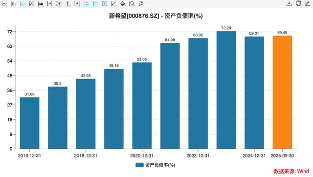财务数据显示,截至2022年末、2023年末、2024年末和2025年9月末,新希望总负债分别为929.64亿元、936.80亿元、813.68亿元和812.16亿元,资产负债率分别高达68.02%、72.28%、69.01%和69.49%。
