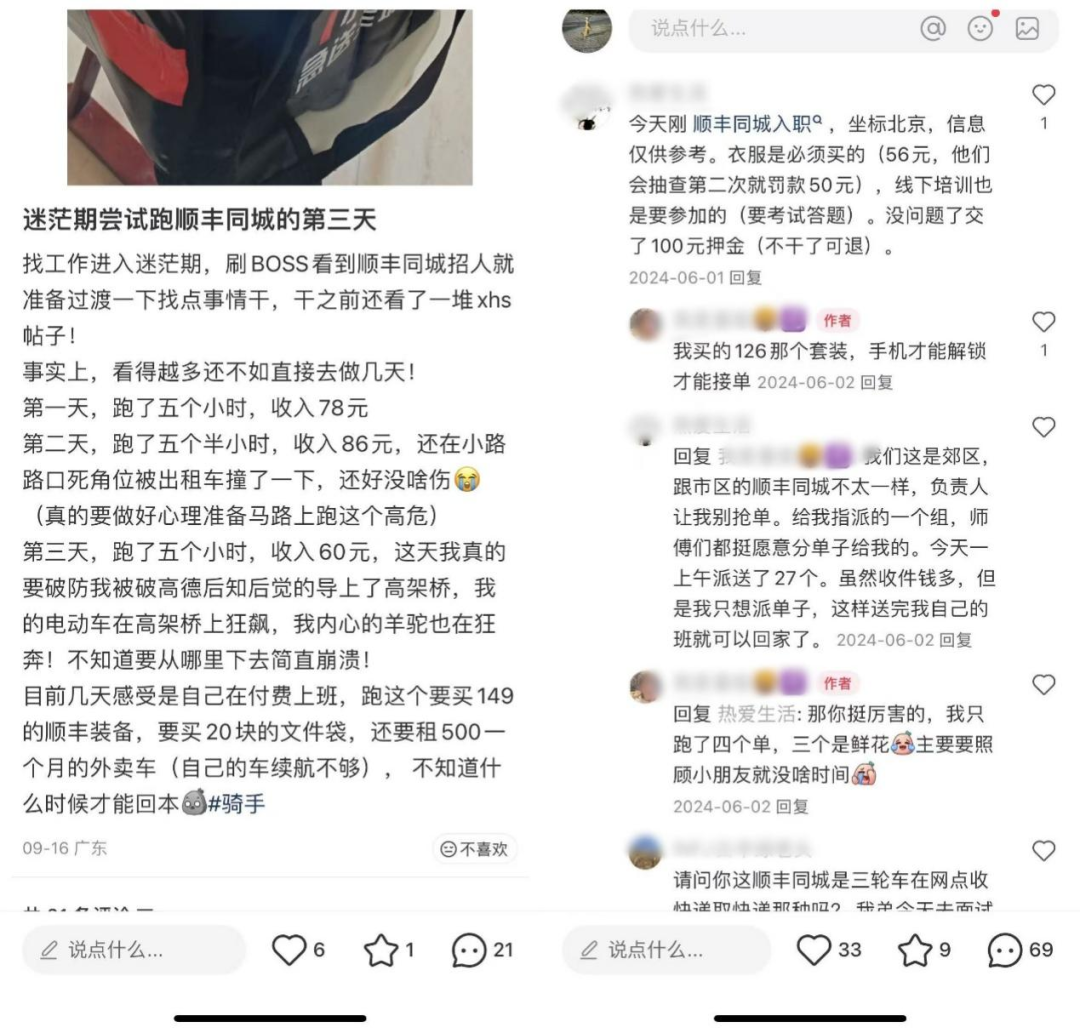 也有骑手表示顺丰同城的罚款概率非常高,甚至在无违规的情况下,也被平台强行判罚。新手骑手加入的话,也要在指定平台上购买工服等装备,多少有点捆绑销售的意味。
