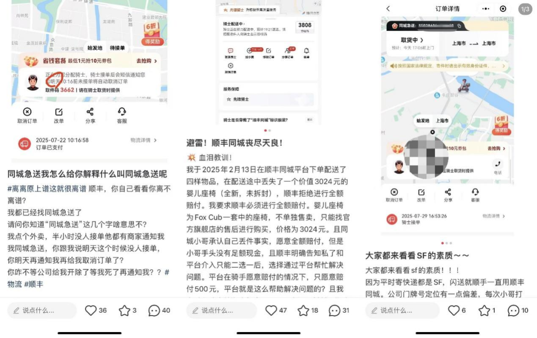 骑手的不满与日俱增,这份“怨气”也传递到了用户层面。在社交平台上,不少用户吐槽顺丰同城收着更贵的配送费,态度却反而更差,比如无人接单、丢失物品、辱骂客户等。