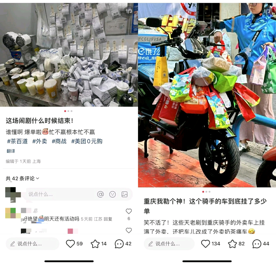 今年7月,外卖大战迎来了阶段性高峰,淘宝闪购宣布启动500亿元的补贴计划,发放了大额红包、免单卡等补贴优惠;美团也不甘示弱,迅速推出各种大额优惠券。两大外卖平台正面交锋,奶茶咖啡的外卖价格低至1元/杯,不少消费者甚至晒出了“零元购”订单。