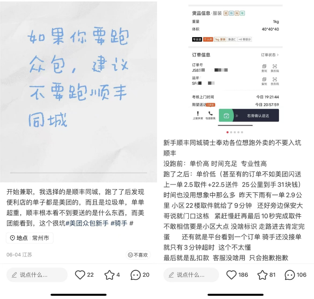 在社交平台上,不少顺丰同城骑手吐槽平台的配送费不仅没有高于其他平台,反而要低出不少。如果是兼职骑手的话,能接到的订单更是其他平台骑手挑剩的订单,路程远,价格低。