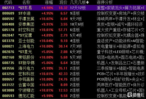 焦点股方面,福建本地股平潭发展9天7板,并购重组的时空科技6连板,煤炭股安泰集团10天6板,机器人概念股亚士创能4连板。