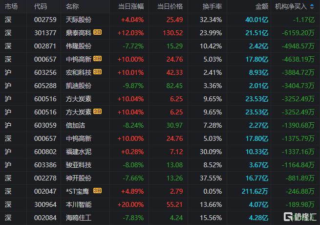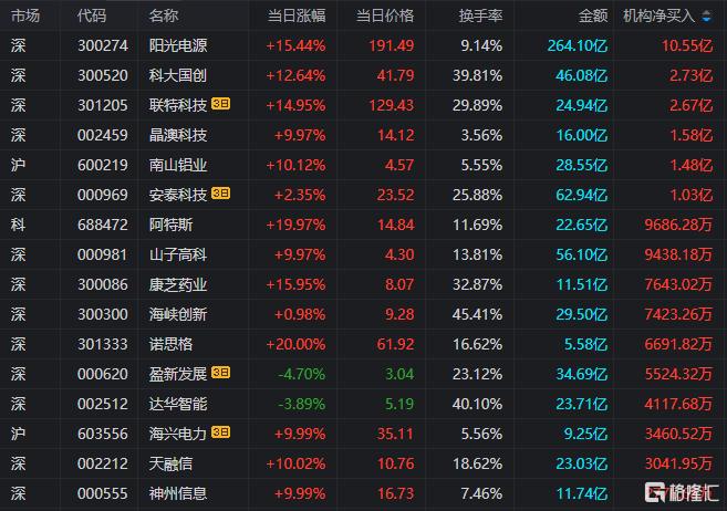 龙虎榜中涉及机构专用席位的个股中,当日净买入额前三为阳光电源、科大国创、晶澳科技,分别为10.55亿元、2.73亿元、1.58亿元。