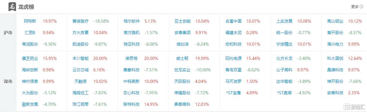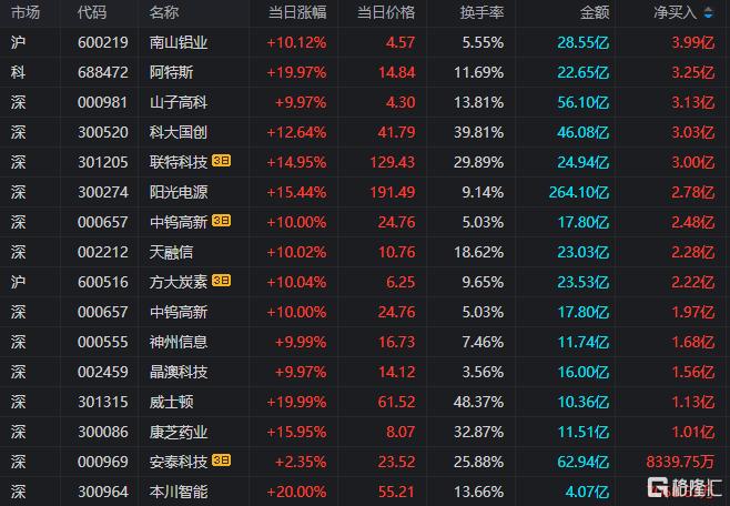龙虎榜单日净买入额前三为南山铝业、山子高科、科大国创,分别为3.99亿元、3.13亿元、3.03亿元。