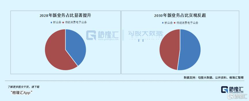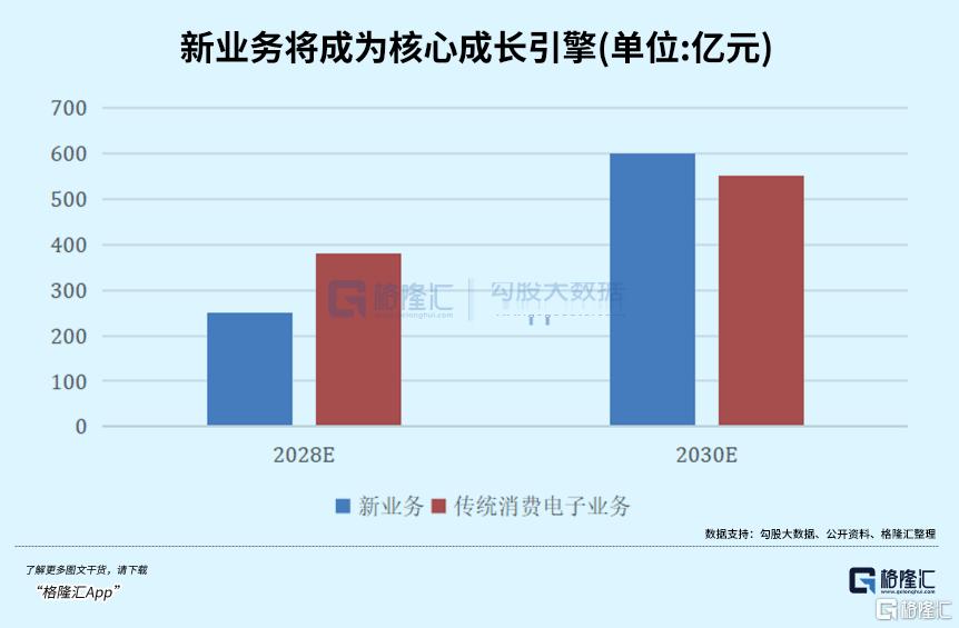 与此同时,传统业务持续稳健增长,在2028年收入突破380亿元,占比约60%;2030年收入超550亿元,占比不到50%,复合增速约20%。