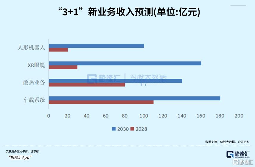 除了车载,AI散热、XR眼镜、机器人已具备较为清晰的产业逻辑和收入爬坡路径,将在五年内形成其他三个百亿级新增长曲线。