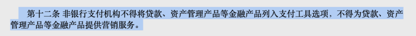 第十二条 非银行支付机构不得将贷款、资产管理产品等金融产品列入支付工具选项,不得为贷款、资产管理产品等金融产品提供营销服务。