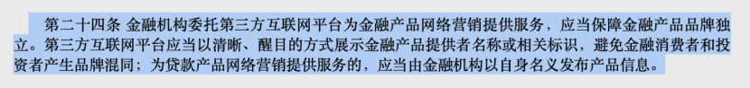 第二十四条 金融机构委托第三方互联网平台为金融产品网络营销提供服务,应当保障金融产品品牌独立。第三方互联网平台应当以清晰、醒目的方式展示金融产品提供者名称或相关标识,避免金融消费者和投资者产生品牌混同;为贷款产品网络营销提供服务的,应当由金融机构以自身名义发布产品信息。