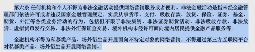 金融机构不得为私募类产品、场外衍生品开展面向不特定对象的网络营销,不得通过第三方互联网平台对私募类产品、场外衍生品开展网络营销。