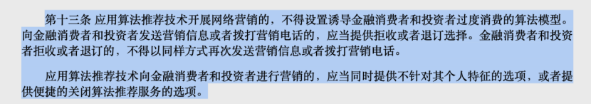第十三条 应用算法推荐技术开展网络营销的,不得设置诱导金融消费者和投资者过度消费的算法模型。向金融消费者和投资者发送营销信息或者拨打营销电话的,应当提供拒收或者退订选择。金融消费者和投资者拒收或者退订的,不得以同样方式再次发送营销信息或者拨打营销电话。