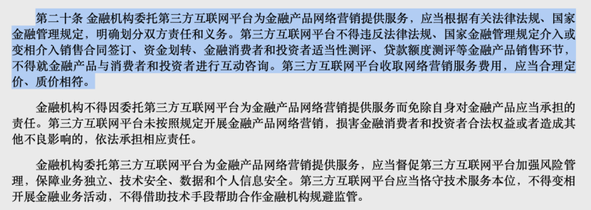 第二十条 金融机构委托第三方互联网平台为金融产品网络营销提供服务,应当根据有关法律法规、国家金融管理规定,明确划分双方责任和义务。第三方互联网平台不得违反法律法规、国家金融管理规定介入或变相介入销售合同签订、资金划转、金融消费者和投资者适当性测评、贷款额度测评等金融产品销售环节,不得就金融产品与消费者和投资者进行互动咨询。第三方互联网平台收取网络营销服务费用,应当合理定价、质价相符。