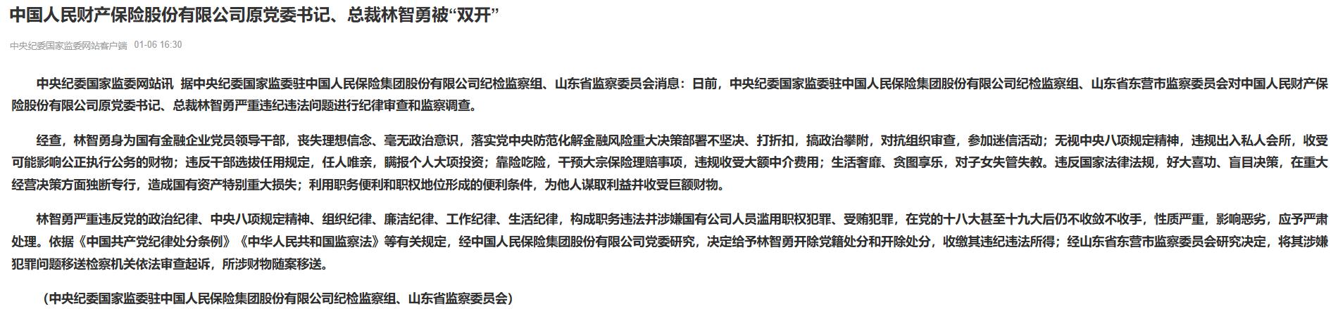 此次事件并非人保财险首次遭遇高管震荡。于泽是人保财险近五任“一把手”中第三位被查的高管。此前的2022年5月,人保财险原党委书记、总裁林智勇被带走调查;2023年1月,林智勇被“双开”,官方通报指出他“靠险吃险,干预大宗保险理赔事项,违规收受大额中介费用”。