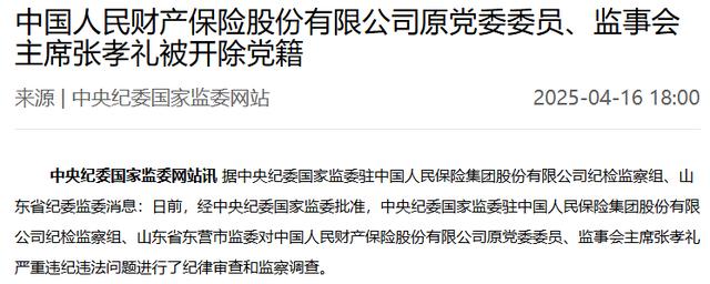 2025年4月,人保财险原党委委员、监事会主席张孝礼也因涉嫌严重违纪违法被开除党籍。