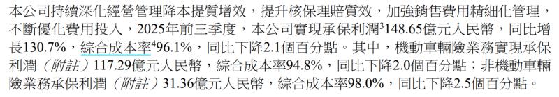 从2021年到2024年,人保财险年度保费收入从4400亿元增至5400亿元,市场份额稳定在三成以上。2025年前三季度,人保财险实现保险服务收入3859.21亿元,同比增长5.9%;净利润达到402.68亿元,同比增长50.5%。综合成本率降至96.1%,同比下降2.1个百分点,显示出承保盈利能力显著提升。