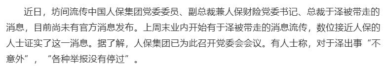 于泽被带走的消息在业内迅速传开。据《证券时报网》等报道,数位接近人保的人士证实了这一事件,人保集团已迅速为此召开党委会会议。