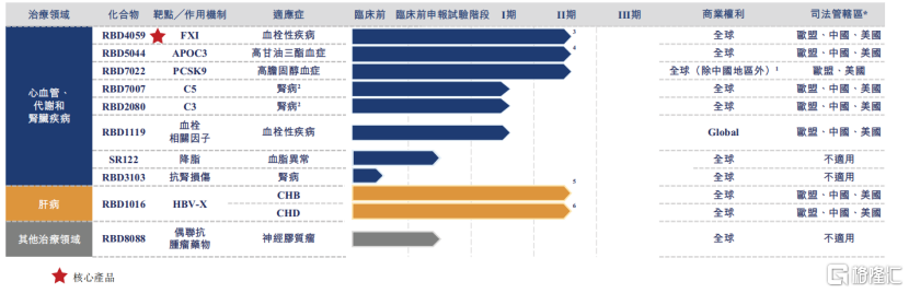 核心产品RBD4059:全球首款且临床进展最快的靶向凝血因子FXI的siRNA药物,用于治疗血栓性疾病。其优势在于在有效抗凝的同时,出血风险显著低于传统疗法,且给药频率低,患者依从性高。该产品针对冠心病的2a期试验已于2025年2月完成患者入组。