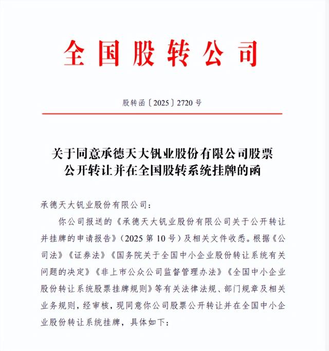 12月3日,航空航天级钛合金及高温合金用特种中间合金等先进金属材料研发制造商承德天大钒业股份有限公司(以下简称“天大股份”)获批在全国中小企业股份转让系统挂牌。