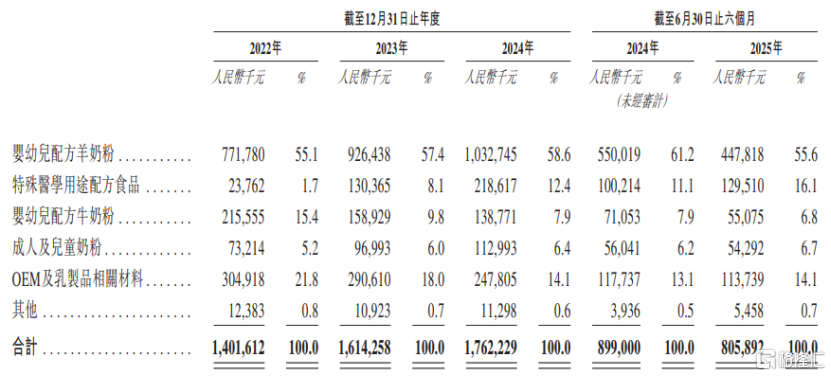 具体来看,2024年,婴幼儿配方羊奶粉为公司贡献了58.6%的收入,特殊医学用途配方食品、婴幼儿配方牛奶粉、成人及儿童奶粉、OEM及乳制品相关材料的收入占比分别为12.4%、7.9%、6.4%、14.1%。