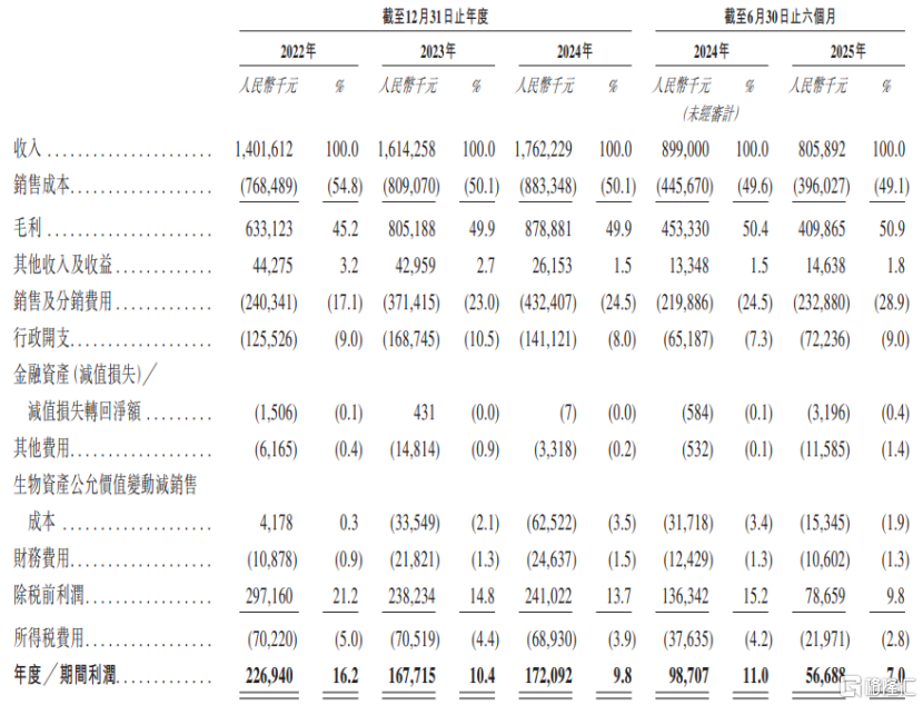 2022年、2023年、2024年、2025年1-6月(简称“报告期”),宜品营养的营业收入分别约14.02亿元、16.14亿元、17.62亿元、8.06亿元,毛利率分別为45.2%、49.9%、49.9%、50.9%,对应的净利润分别约2.27亿元、1.68亿元、1.72亿元、0.57亿元。