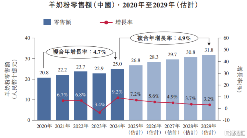 2020年至2024年,中国羊奶粉零售额从208亿元增长至250亿元,复合年增长率为4.7%。预计到2029年羊奶粉零售额将达到318亿元,2024年至2029年的复合年增长率为4.9%。