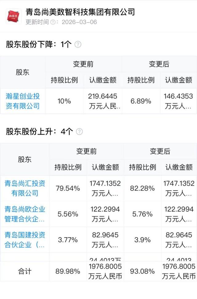 天眼查APP显示,3月6日,集团注册资本从2196.445043万元减少至2123.23584万元,下降约73万元。其中瀚星创业投资有限公司持股比例下降,青岛尚汇投资、青岛尚欧企业管理、青岛国建投资股份比例上升。其中瀚星创投对尚美数智的首次持股日期为2021年11月。