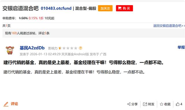 基金业绩亏损,有基民表示,交银启道4年多了一直亏损,这样的经理还不换人。也有基民表示,强烈要求换基金经理,这么好的股市,这个基金却天天下跌,基民的真金白银就这么亏没了啊!甚至有基民表示,真的是史上最差,基金经理在干嘛!亏得那么稳定,一点都不动。