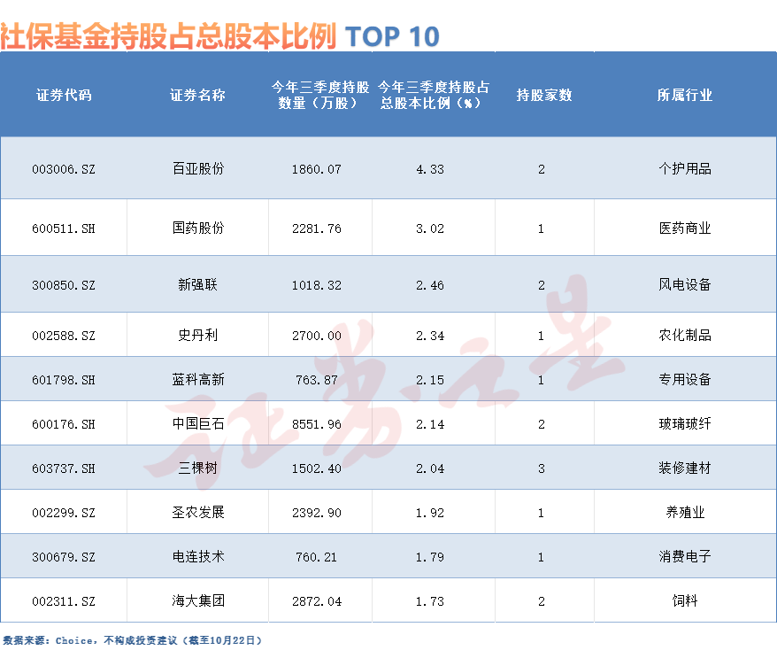 据Choice数据,截至10月22日,已有近300家 A 股上市公司公布了 2025 年三季报,其中33家上市公司的前十大流通股东名单里出现了社保基金的身影。