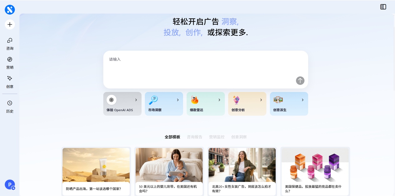 • 自然语言对话框:“为我在东南亚上线一个美妆视频广告”