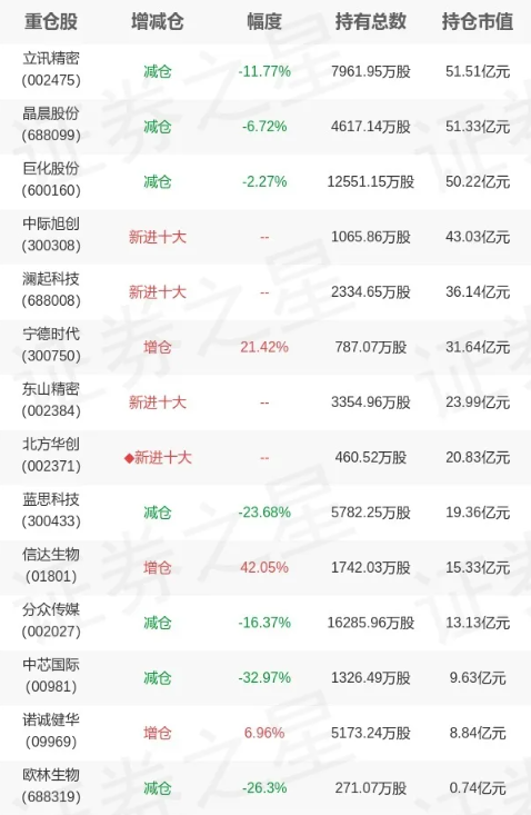 例如,新进中际旭创、澜起科技、东山精密、北方华创等;增持宁德时代、信达生物等。