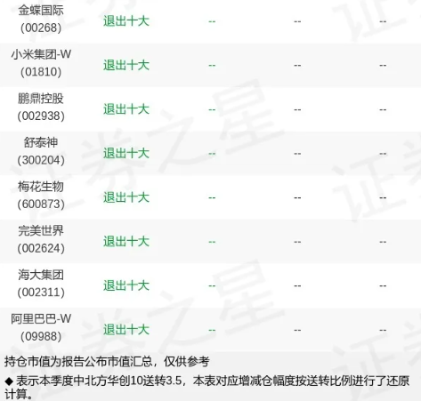 此外,小米集团、阿里巴巴、鹏鼎控股、完美世界等此前重仓持有公司,则退出十大重仓股之列。