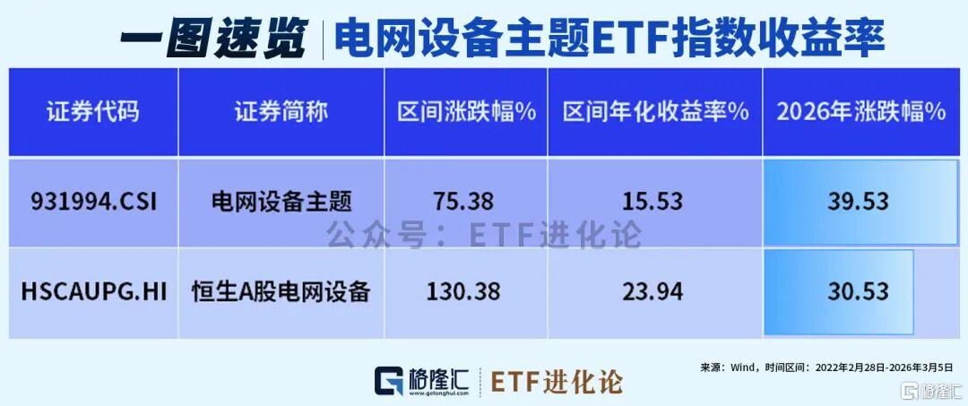 恒生A股电网设备指数历史业绩较好,2022年2月28日以来的年化收益率超23%,电网设备主题指数今年表现更强势,截至3月5日,年内累计上涨39.53%。