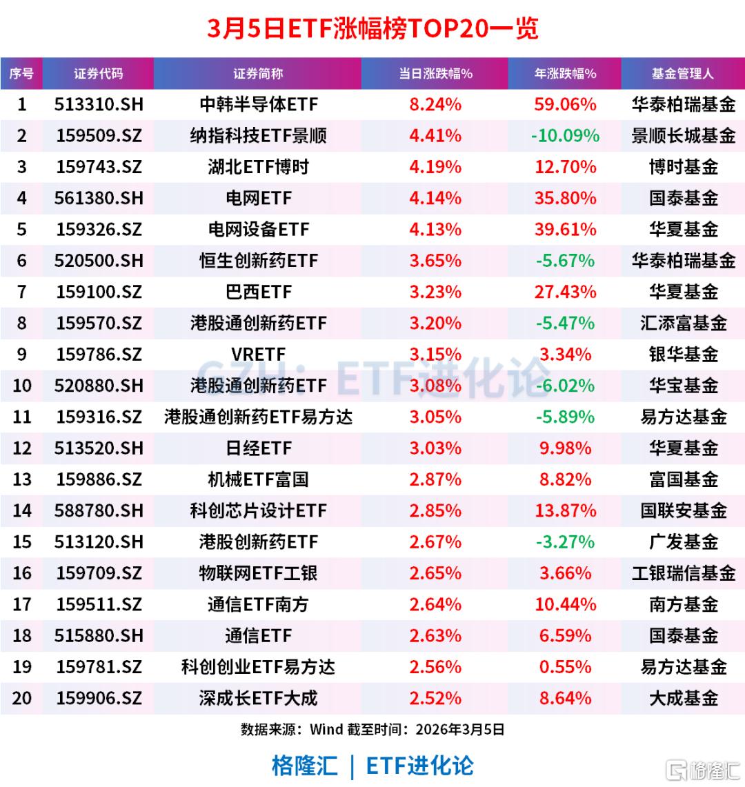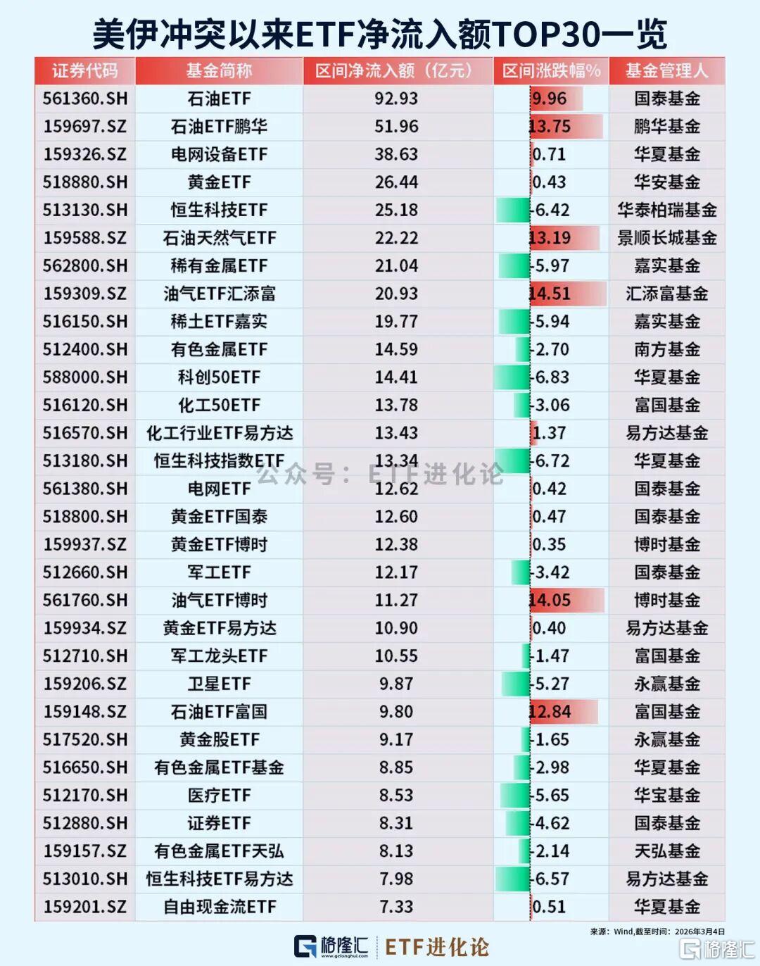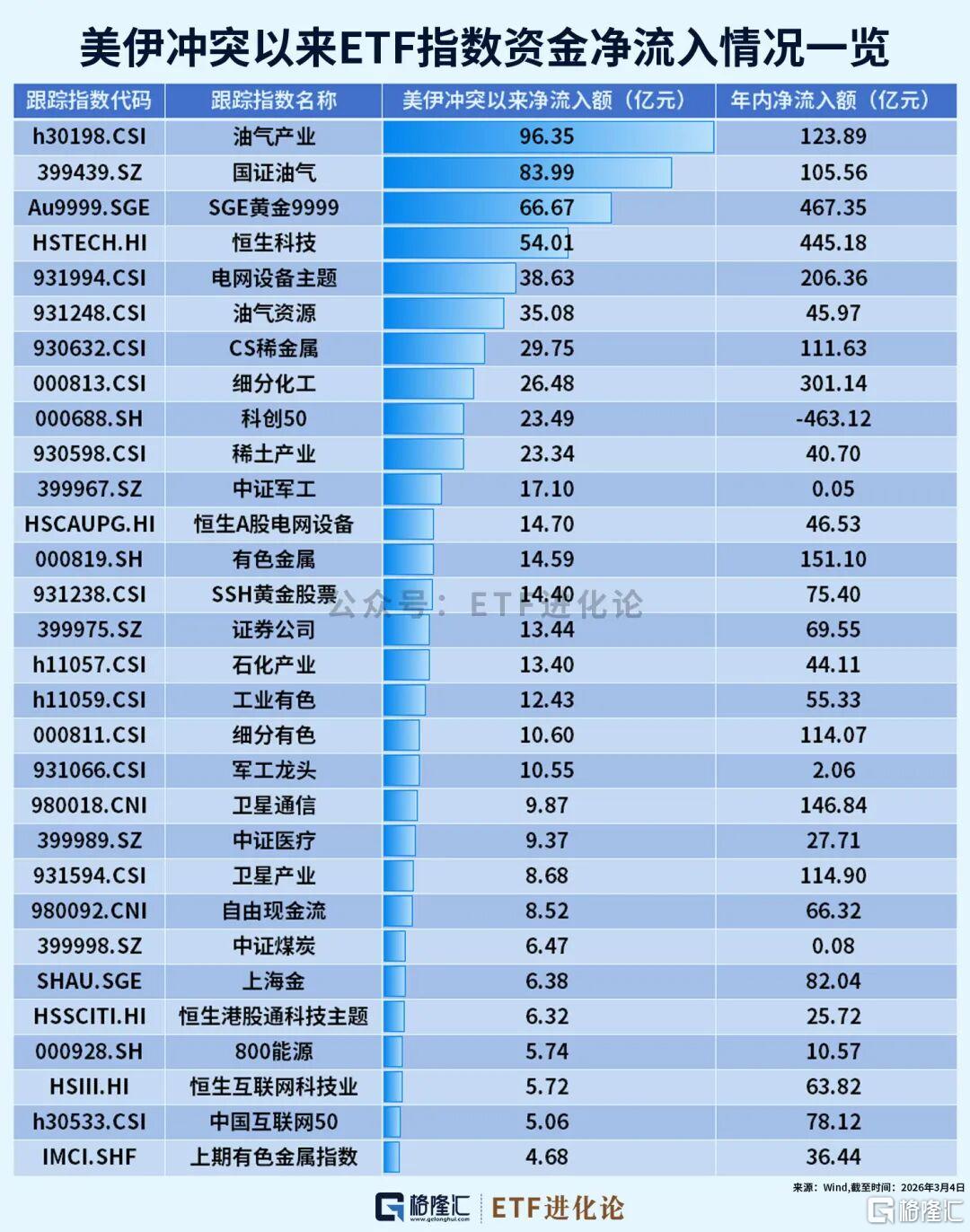 美伊冲突以来,ETF市场净流入397亿元,资金除了抢筹油气产业、国证油气、SGE黄金9999等避险指数,电网设备主题、恒生A股电网设备指数“吸金”力度也不容小觑,前者年内合计流入额超200亿元。