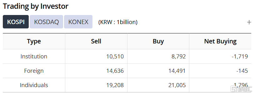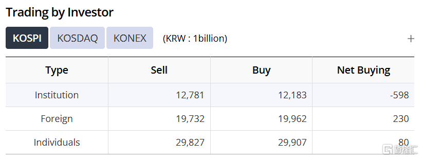 相比机构投资者,外资反而更坚定看好韩股,在过去暴跌的两个交易日合计净买入了2310亿韩元的Kospi股票。