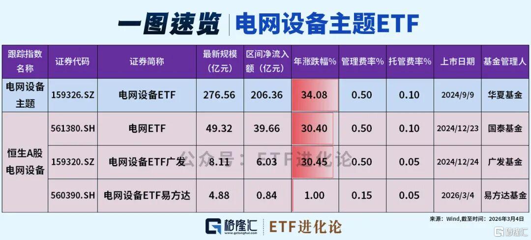 目前A股跟踪电网设备主题指数的ETF产品只有电网设备ETF(159326),且规模最大,最新为276.56亿元。