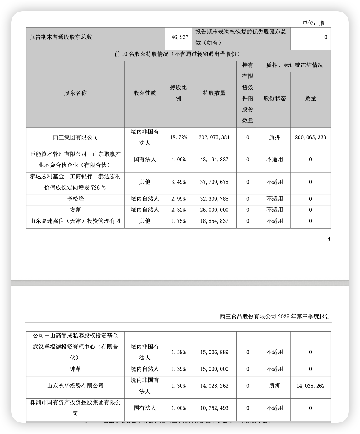 根据西王食品2025年第三季度报告,截至2025年9月末,公司前十大股东合计持股38.35%,股权结构较为分散。其中,控股股东西王集团以18.72%的持股比例位居第一大股东,但其持有的99.01%股份已处于质押状态。值得注意的是,第二大股东巨能资本背景为山东国资,持股4.00%;第四、第五大股东李松峰、方蕾分别持股2.99%和2.32%,第八大股东钟革持股1.39%,均为近年来活跃于A股法拍市场的自然人投资者,其股份多通过司法拍卖竞得。