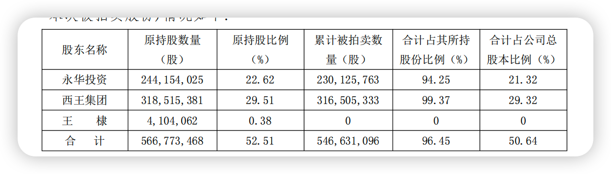 截至2025年5月,西王集团、永华投资累计被拍卖的股份合计约3.47亿股,合计占其所持股份比例的61.59%,占西王食品总股本的32.11%。随着此次西王集团所持2亿股股份被摆上司法拍卖台,上述累计被拍卖规模或将进一步扩大。截至本次公告披露日,西王集团及其一致行动人累计被拍卖股份已达5.4663亿股,占公司总股本的50.64%。