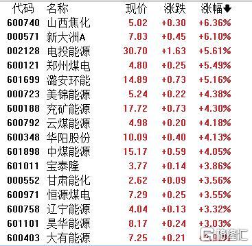 煤炭开采加工板块涨幅居前,山西焦化、新大洲A涨超6%,电投能源、郑州煤电、潞安环能、美锦能源、兖矿能源、云煤能源等跟涨。