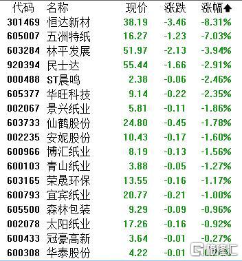 造纸板块跌幅居前,恒达新材跌超8%,五洲特纸、林平发展、华旺科技、景兴纸业等跟跌。