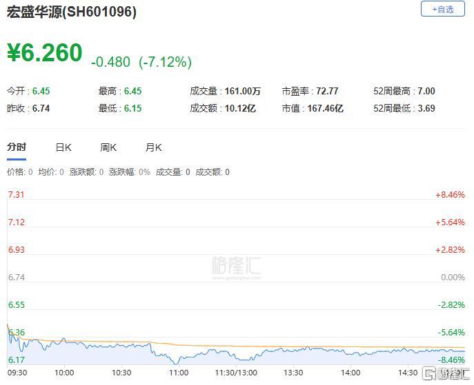 宏盛华源跌近7%,昨日该股一度触及涨停且刷新近期高点,现报6.26元,总市值167.46亿元。