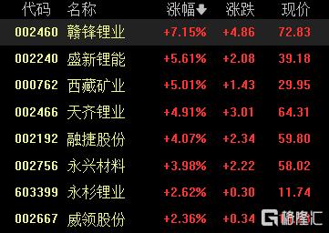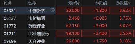 港、A股锂电池板块持续走强。A股中,赣锋锂业涨超7%,盛新锂能西藏矿业涨超5%;港股中,中创新航涨超6%,洪桥集团、赣锋锂业涨超5%,天齐锂业涨超3%。