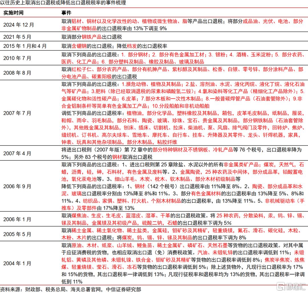 中信证券研报指出,此次出口退税调整带来的“抢出口”窗口期或对2026年一季度相关商品出口带来利好,但可能对“抢出口”窗口期后相关商品的出口增速构成一定下拉。判断出口退税政策退坡的趋势会延续,梳理后发现当前在出口中占比较大并且出口退税税率较高的商品还包括化学品、塑料制品、服装、机械和电气产品以及交运设备等,相关品类在未来可能会有跟进调整出口退税的措施。