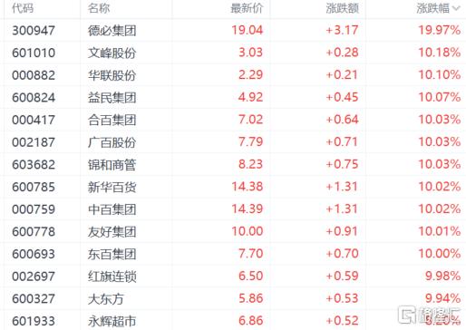 其中,德必集团、文峰股份、华联股份、居然智家、益民集团等十余股涨停。东百集团、中百集团双双斩获6连板。