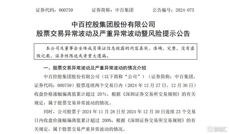在2024年底最后一天,公司公告称“股票交易严重异常波动”。