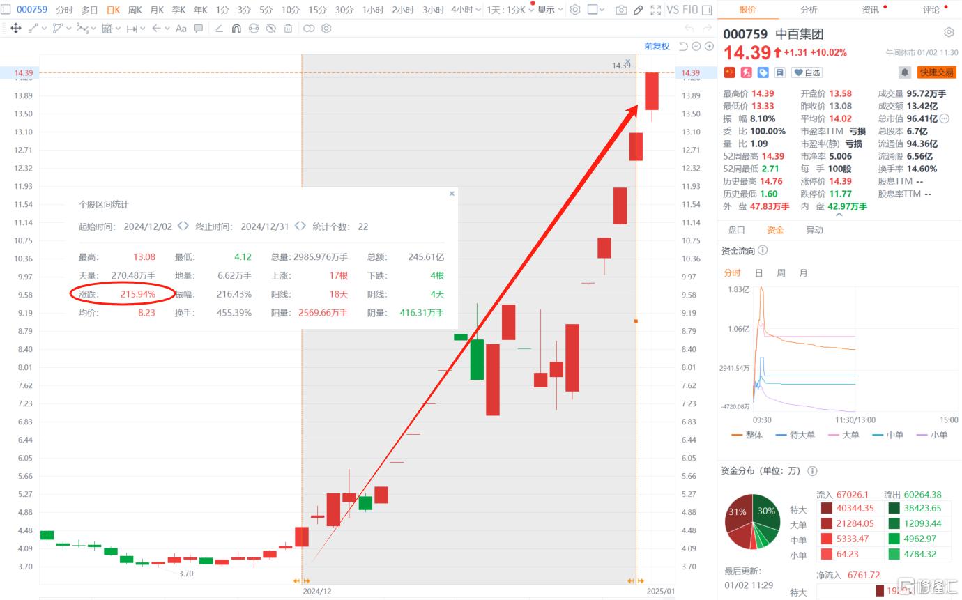 号称“跨年大妖股”的零售龙头——中百集团从年尾又涨到了年头,势头十分凶猛。