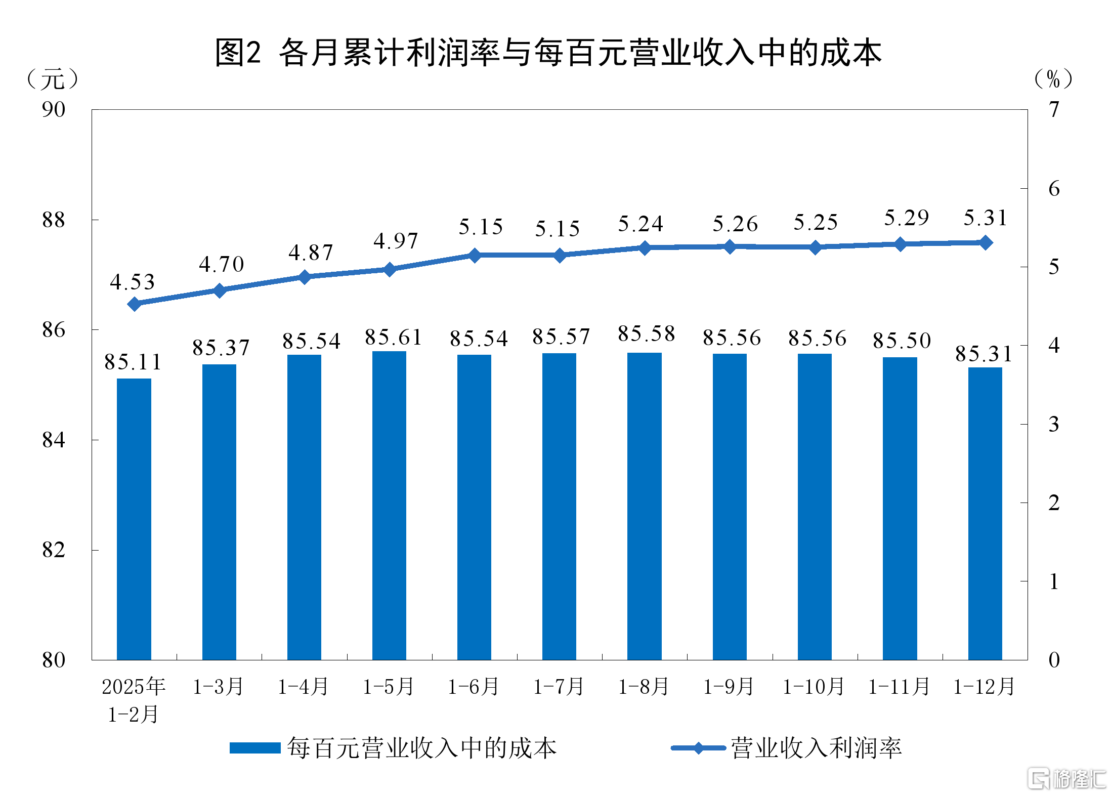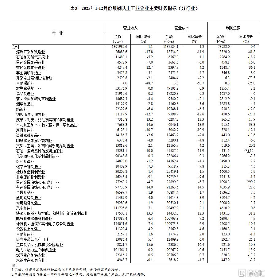 国家统计局工业司首席统计师于卫宁解读2025年工业企业利润数据时指出, 2025年,各地区各部门加紧实施更加积极有为的宏观政策,加快推进新型工业化,推动工业经济稳定向好运行。全年工业企业利润实现增长,扭转了连续三年下降态势,其中装备制造业、高技术制造业等新动能支撑作用明显,传统产业利润结构持续优化,工业经济发展质效不断提升。