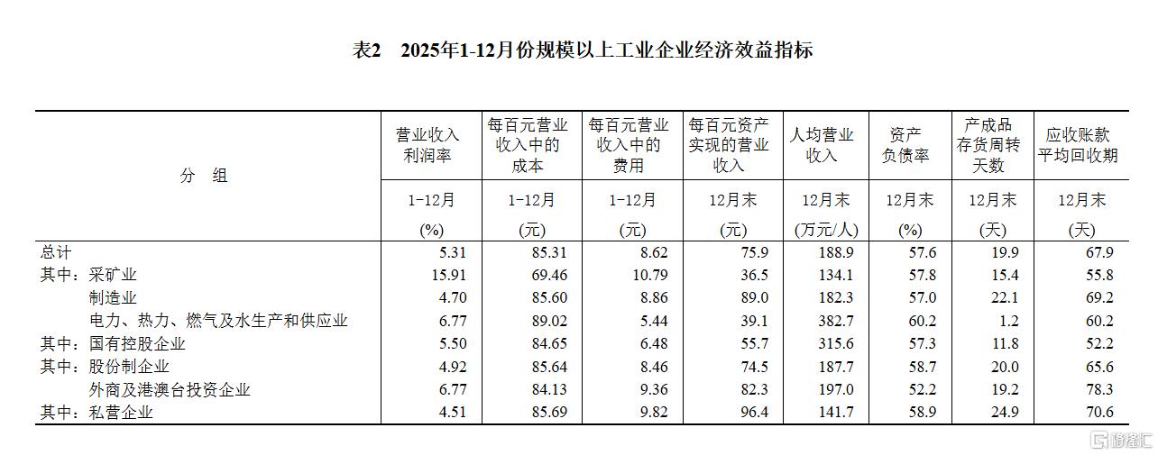 2025年末,规模以上工业企业每百元资产实现的营业收入为75.9元,比上年末减少2.7元;人均营业收入为188.9万元,比上年末增加5.5万元;产成品存货周转天数为19.9天,比上年末增加0.6天;应收账款平均回收期为67.9天,比上年末增加3.6天。