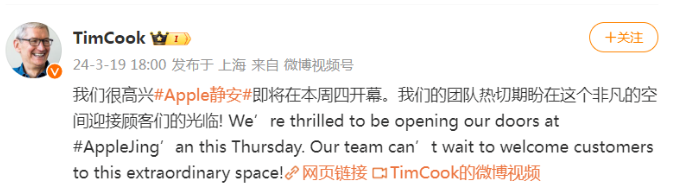 3月19日晚间库克发微博称,我们很高兴Apple静安店即将在本周四开幕。我们的团队热切期盼在这个非凡的空间迎接顾客们的光临!